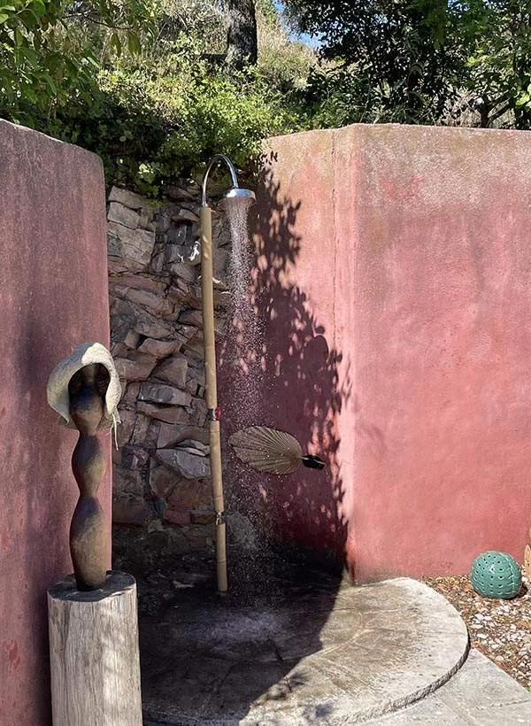 Douche extérieure, chaises longues, canapé et transats ...